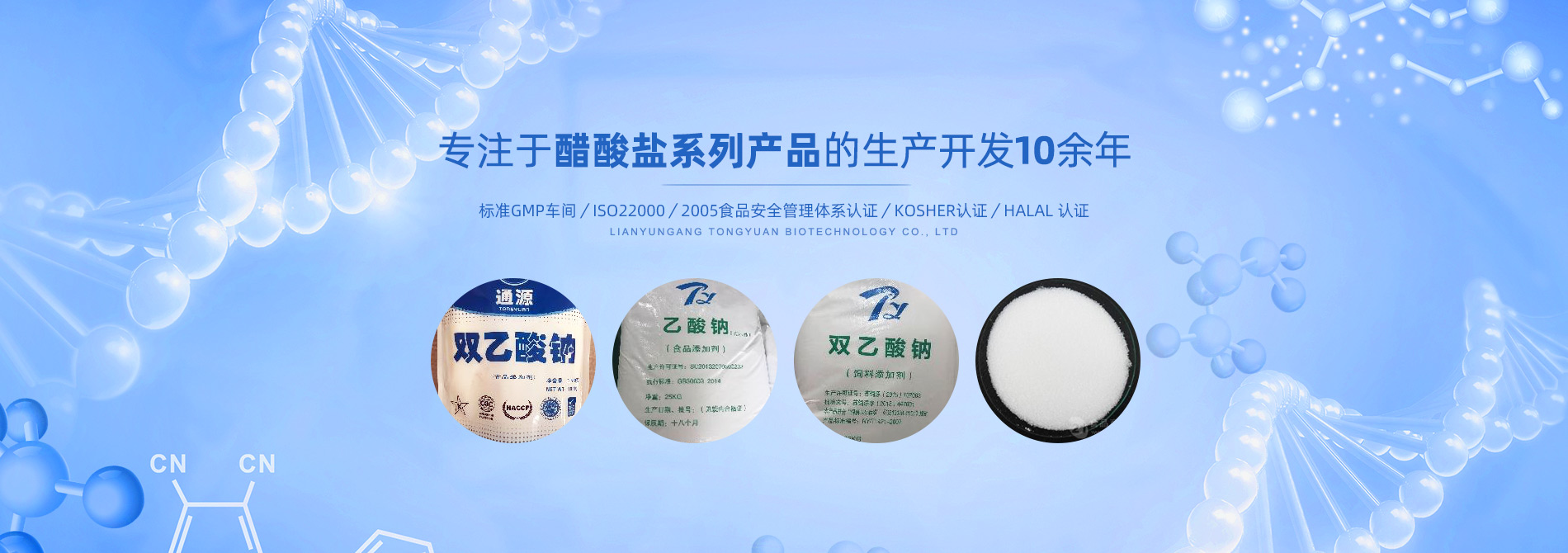 連云港市通源生物科技有限公司 是生產(chǎn)雙乙酸鈉、無水醋酸鈉、三水醋酸鈉、醋酸鉀、乙酸鈉、丙酸鈉、丙酸鈣和氯化鉀等系類醋酸鹽產(chǎn)品的專業(yè)制造商。公司專注于醋酸鹽系列產(chǎn)品的生產(chǎn)開發(fā)10余年,是國內(nèi)專業(yè)醋酸酸鹽產(chǎn)品生產(chǎn)基地?! ∧壳?,我們已和全球30多個國家和地區(qū)建立長期的業(yè)務(wù)合作關(guān)系,是中國較大的雙乙酸鈉生產(chǎn)商和出口商之一。作為中國食品添加劑和配料協(xié)會理事單位,通源公司已建成標準GMP車間5000余平方米,通過了ISO22000:2005食品安全管理體系認證、KOSHER認證、HALAL 認證等,這些都是我們提供高質(zhì)量產(chǎn)品和優(yōu)良服務(wù)的前提和確保。 生產(chǎn)出色產(chǎn)品,提供優(yōu)良服務(wù),滿足顧客需要,是我們努力的目標。愿和我們的朋友們攜手,共...